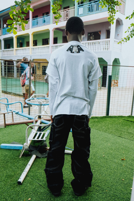 The dark secret denim jeans have intricate white stitching and multiple pockets and custom triple A logo in leather